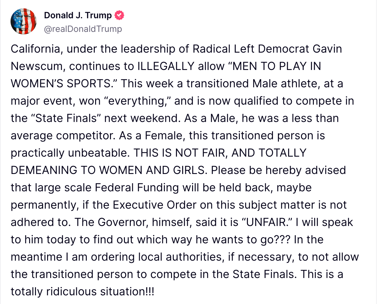 Trump said he plans to speak with Newsom directly and has instructed local authorities to block the athlete’s participation if necessary. He cited his own February executive order, “Keeping Men Out of Women’s Sports,” which bars transgender women and girls from competing in female athletic categories and directs federal agencies to enforce this policy under Title IX.