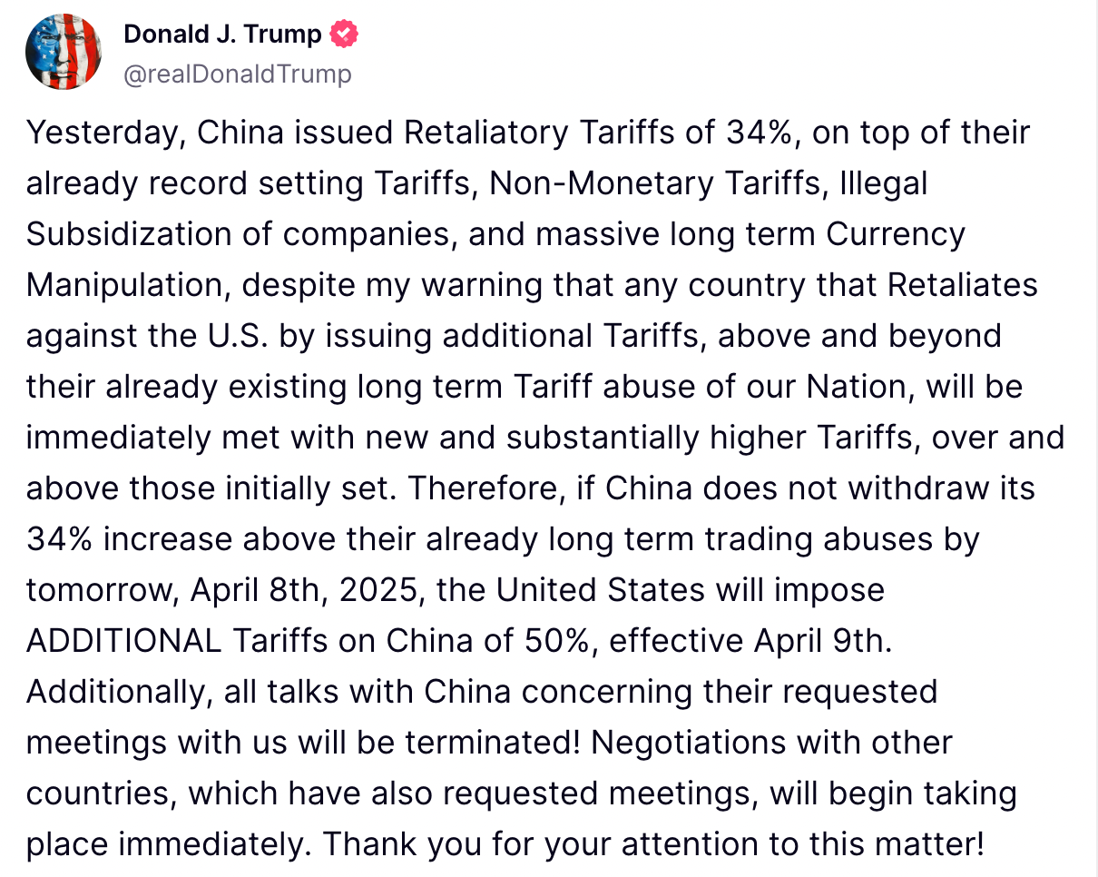 President Donald Trump has threatened to raise U.S. tariffs on China by an additional 50% starting April 9th unless China withdraws its retaliatory 34% tariffs by April 8th. In a post on his Truth Social platform, Trump proposed this one-day ultimatum and criticized China's tariff increases. He labeled them as part of long-standing trade abuses, including currency manipulation and illegal subsidization of companies.