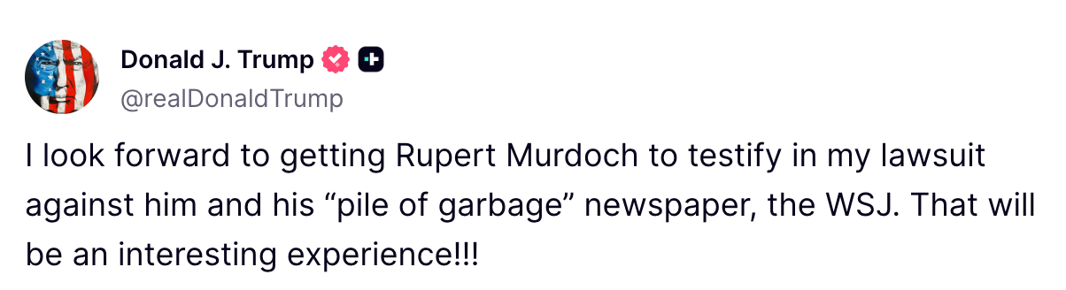 “I told Rupert Murdoch it was a scam... now I’m going to sue his ass off,” Trump wrote on Truth Social, calling the Journal a “pile of garbage.” He said he looks forward to putting Murdoch on the witness stand.