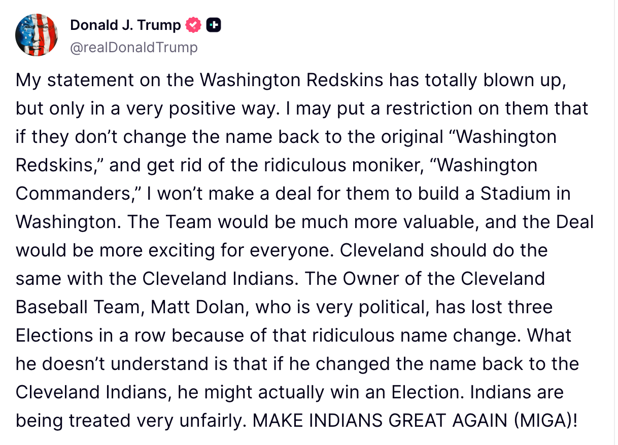 President Donald Trump took to Truth Social on Sunday to call for the Washington Commanders and Cleveland Guardians to revert to their former team names, which were dropped in recent years amid concerns of racial insensitivity toward Native Americans.