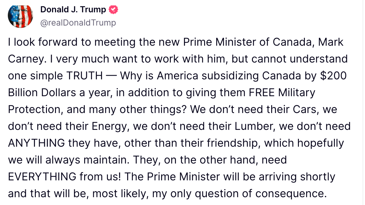 Ahead of his highly anticipated meeting with Canada’s newly appointed Prime Minister Mark Carney, President Donald Trump took to Truth Social, expressing frustration over the financial dynamics between the U.S. and Canada. In a post, Trump questioned why America continues to subsidize Canada by $200 billion annually, in addition to providing free military protection.