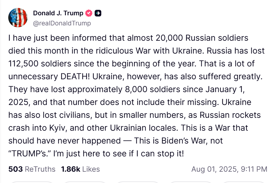 President Donald Trump intensified pressure on Russia to end the war in Ukraine, calling the conflict a needless tragedy that should never have started. In a post on Truth Social, Trump revealed that nearly 20,000 Russian soldiers died in July alone, bringing Moscow's 2025 toll to over 112,000.