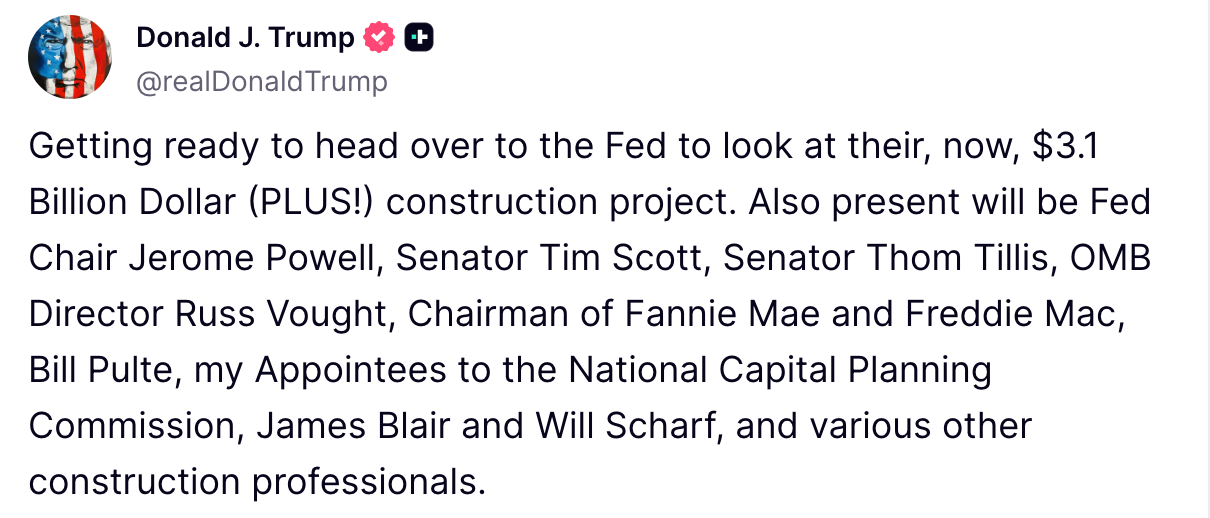 President Donald Trump announced via Truth Social that he is visiting the Federal Reserve’s ongoing $3.1 billion (and growing) construction project in Washington, D.C., calling attention to what he suggested is excessive government spending.
