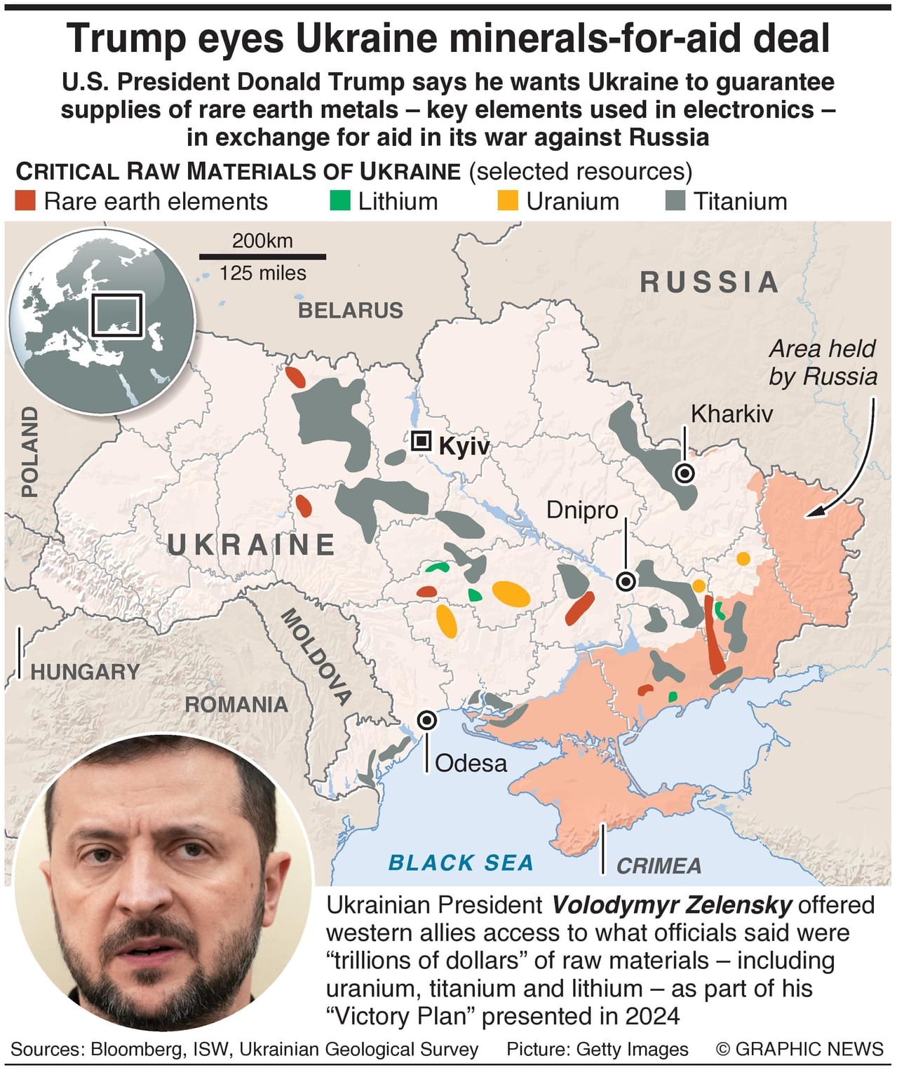 As part of his “Victory Plan” presented last year to western leaders, Ukrainian President Volodymyr Zelenskiy offered western allies access to what officials said were “trillions of dollars” of raw materials, including uranium, titanium and lithium. Ensuring Ukraine’s security and its ability to keep the territory with the deposits out of Russian hands are key elements of that plan.