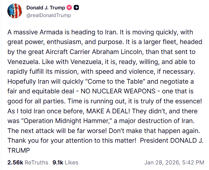 In a series of posts on Truth Social, Trump said a “massive armada,” led by the aircraft carrier USS Abraham Lincoln, is heading toward Iran. He said the fleet is prepared to act swiftly and forcefully if diplomacy fails.