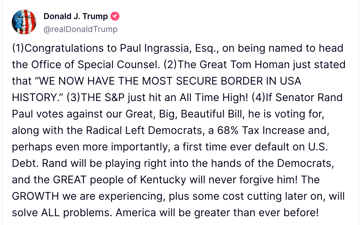 But the president also had sharp words for Kentucky Senator Rand Paul, warning that a vote against what Trump called the “Great, Big, Beautiful Bill” would align him with the “Radical Left Democrats.”