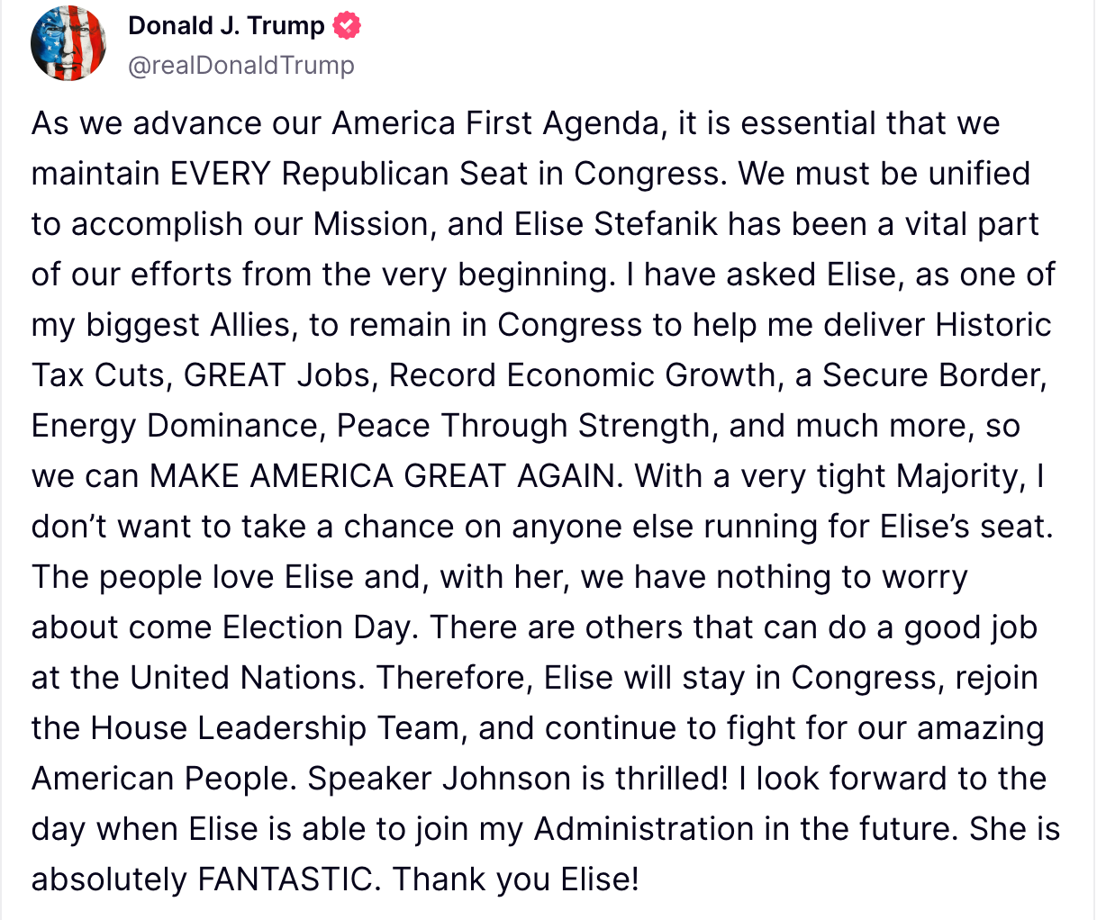 President Donald Trump has pulled the nomination of Rep. Elise Stefanik as U.S. Ambassador to the United Nations, citing the importance of her role in maintaining the Republican majority in the House. Trump announced the decision on Truth Social, expressing confidence in Stefanik’s ability to retain her seat in Congress, which he views as critical for the GOP's legislative agenda. Stefanik had given up her position as House Republican Conference chair in preparation for the UN role.