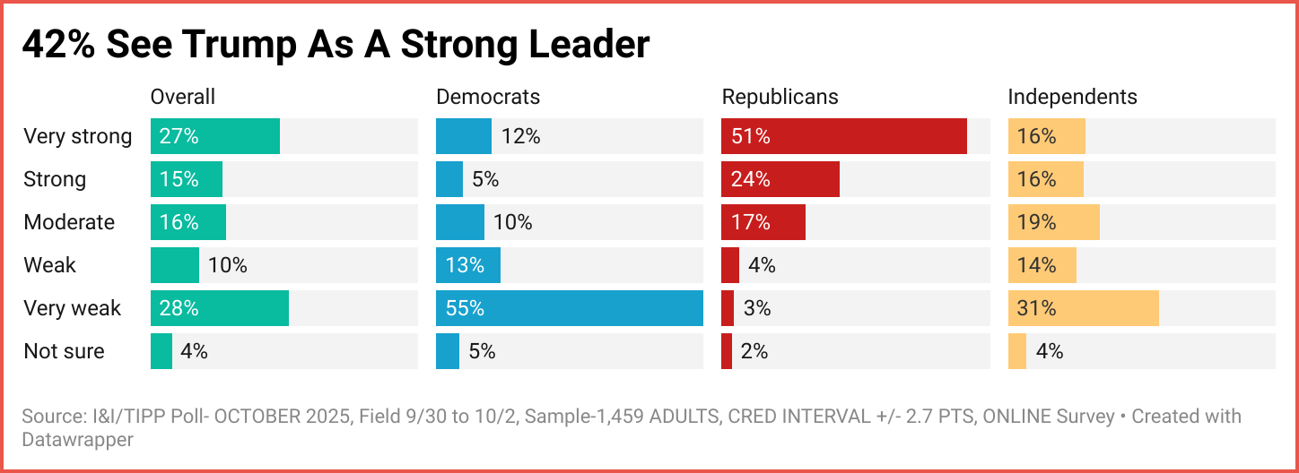 On the other end, 38% described Trump’s leadership as “weak” (10%) or “very weak” (28%), a single percentage-point decline from last month. Only 4% said they weren’t sure in October.