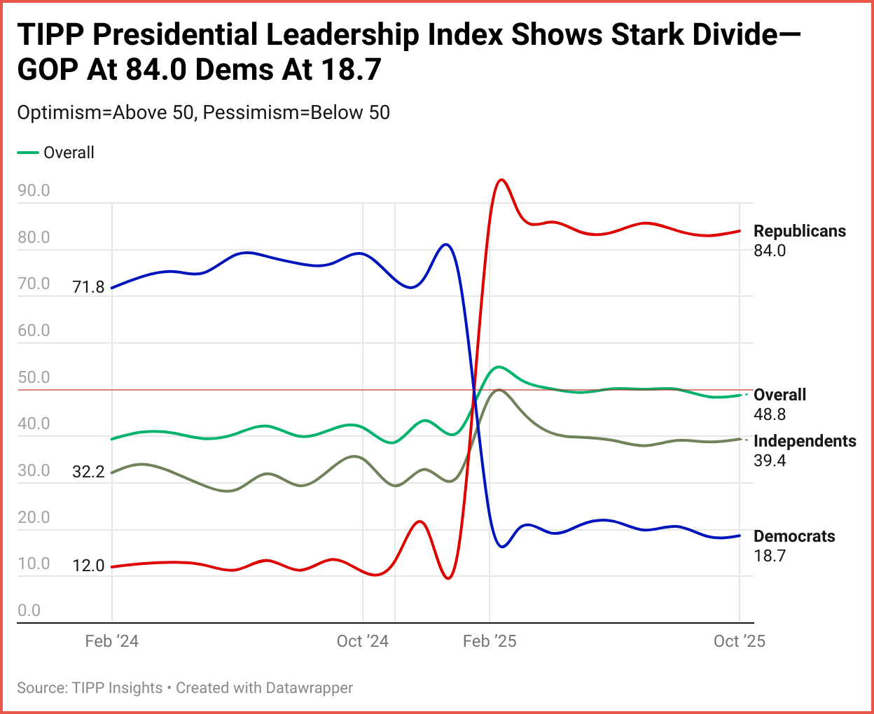 (Below: The TIPP Presidential Leadership Index measures public sentiment over time by combining three components: favorability, job approval, and presidential leadership. The index ranges from 0 to 100, with readings above 50 indicating optimism and below 50 signaling pessimism. In October, the overall index stood at 48.8 (Sep.=48.5), with Republicans most optimistic at 84.0 (Sep. = 83.0), Democrats least at 18.7 (Sep. = 18.5), and independents in between at 39.4.)