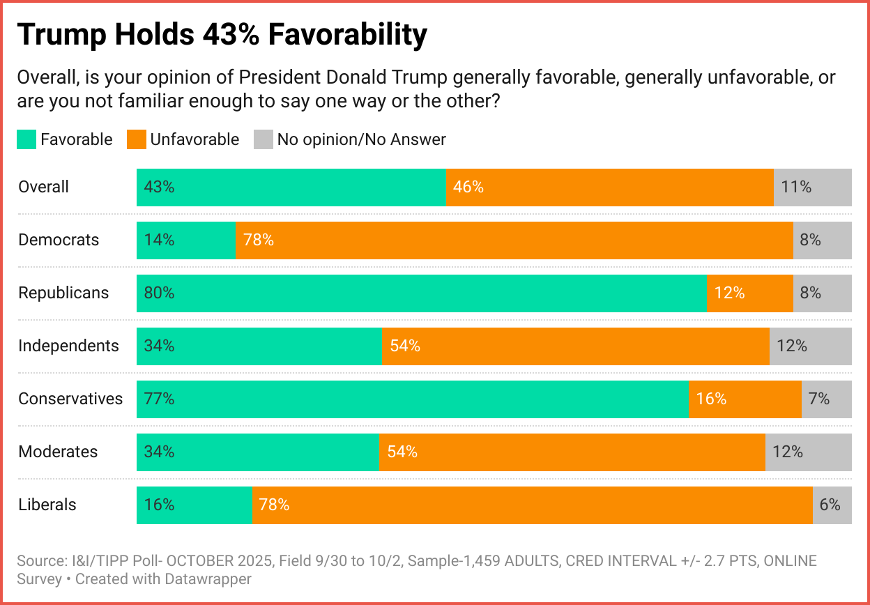 Despite nonstop media controversies swirling about his administration and continued criticism from his political foes, President Donald Trump’s favorability remained rock solid in early October, the latest I&I/TIPP Poll shows.