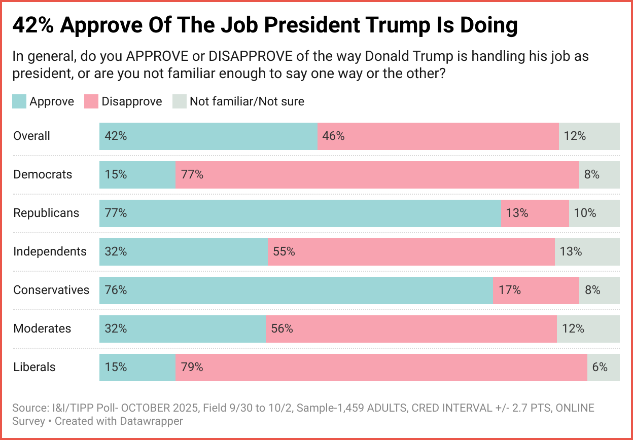 Once more, overall, the numbers are close: In October, 42% approved of the job Trump is doing, while 46% didn’t approve. That compares with 43% approve and 47% disapprove in September.
