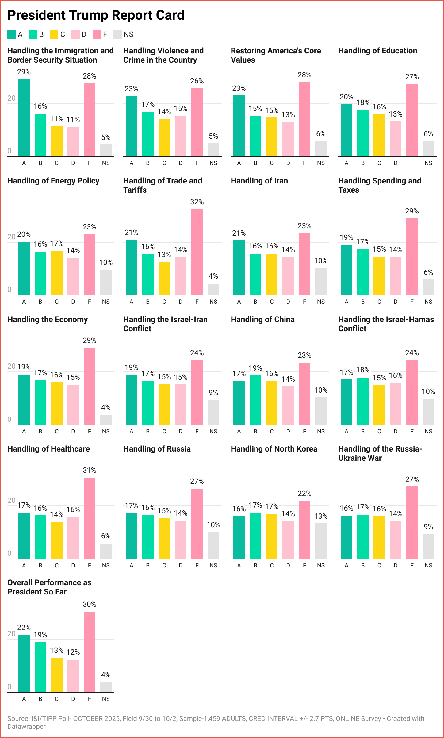 How’s Trump doing? In October, 40% gave the president “good” grades, or As and Bs. That’s the same grade he received in August and September.