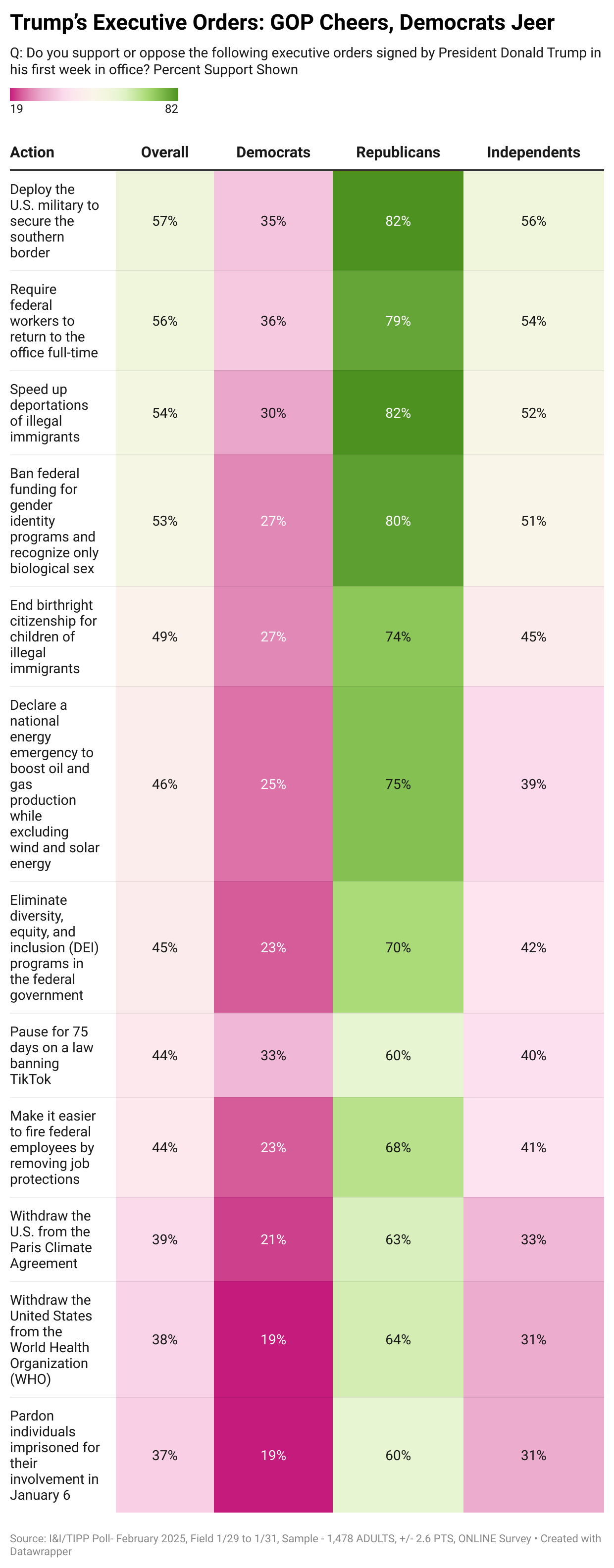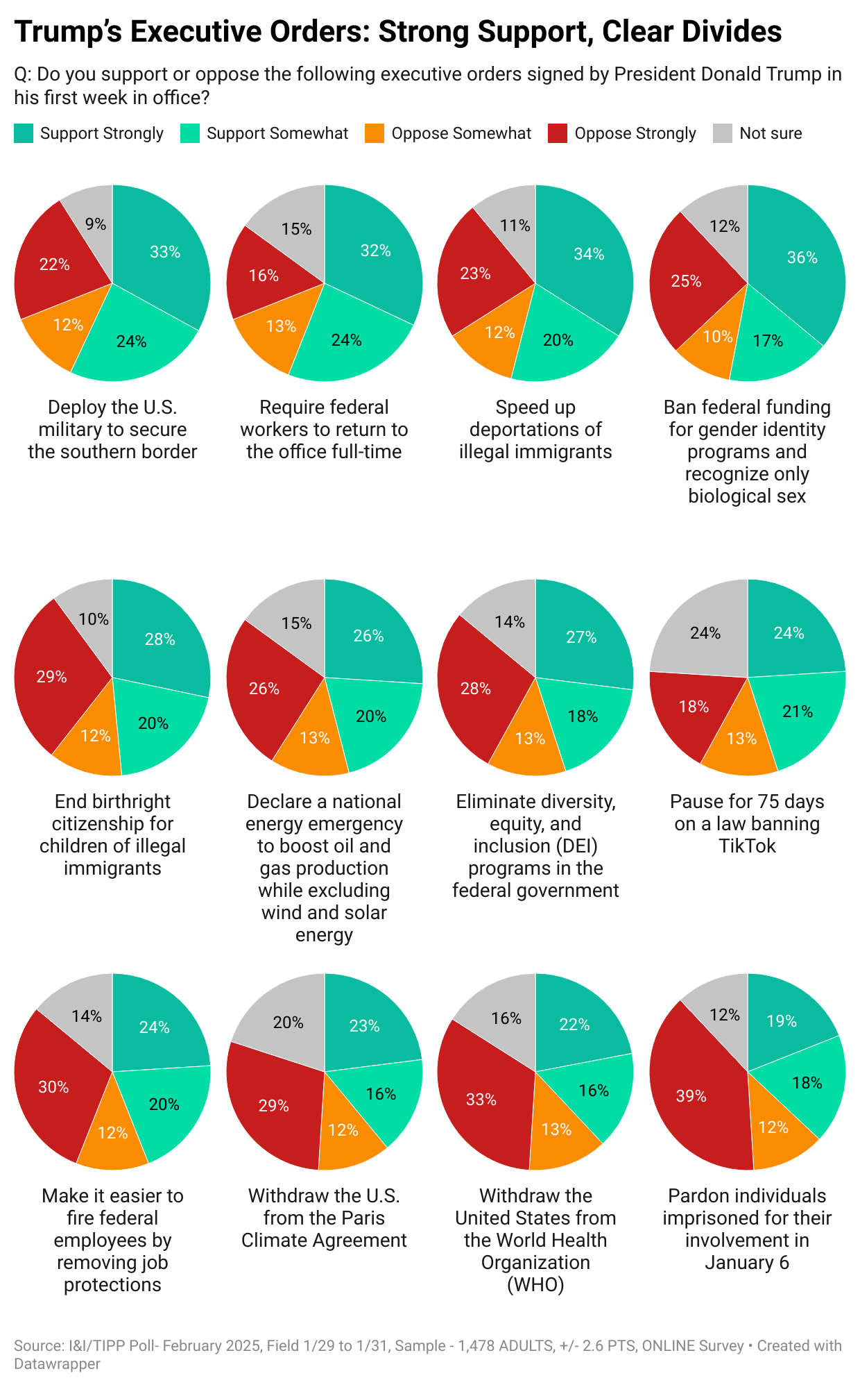 The online I&I/TIPP Poll queried 1,478 adults across the nation on their view of 12 key Trump executive orders, intended to kick-start his second term in office and set a new direction for U.S. policy. The poll has a margin of error of +/-2.6 percentage points.