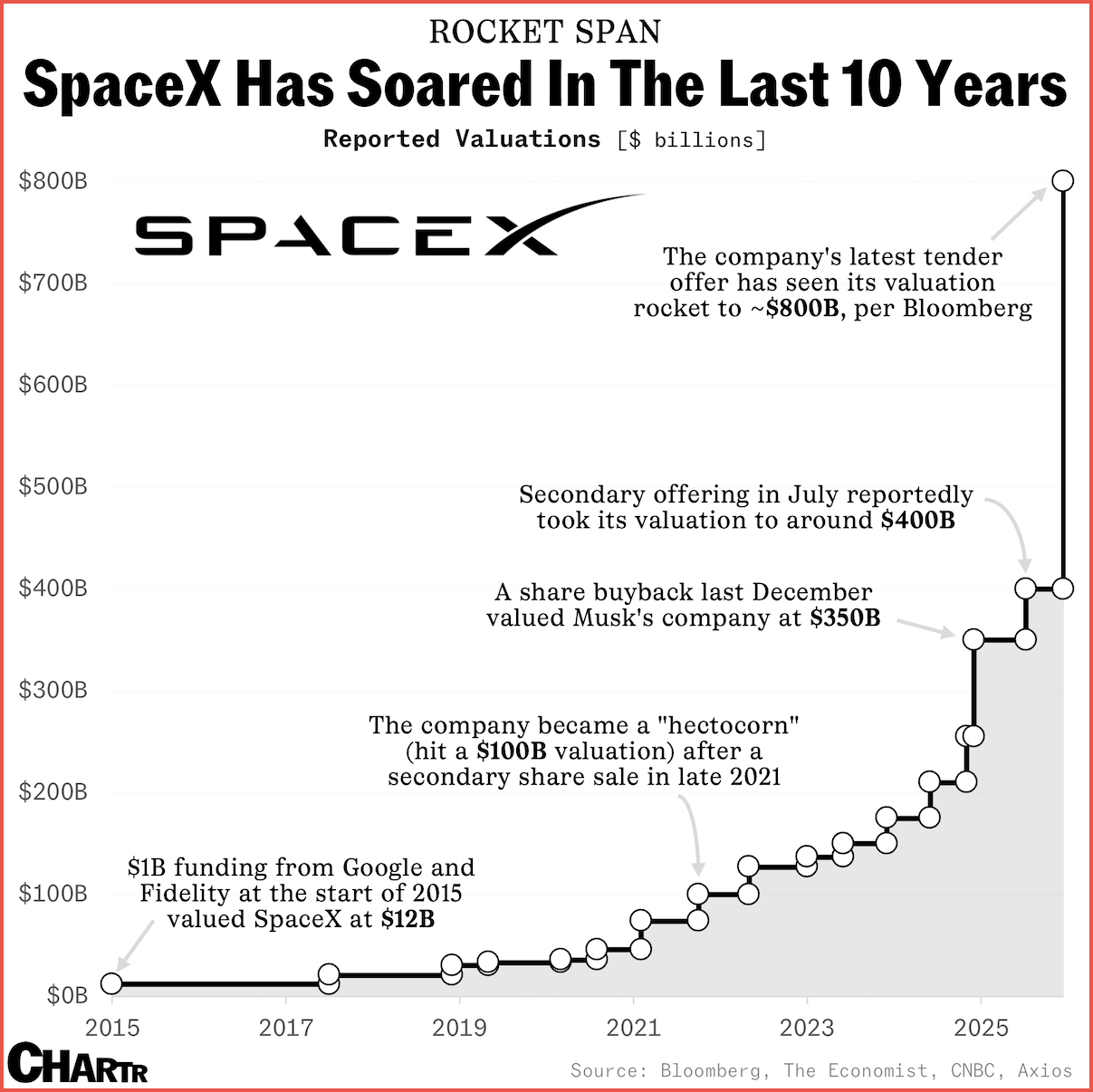 From a $12 billion startup in 2015 to roughly $800 billion today, SpaceX’s reported valuation shows an extraordinary decade of growth.