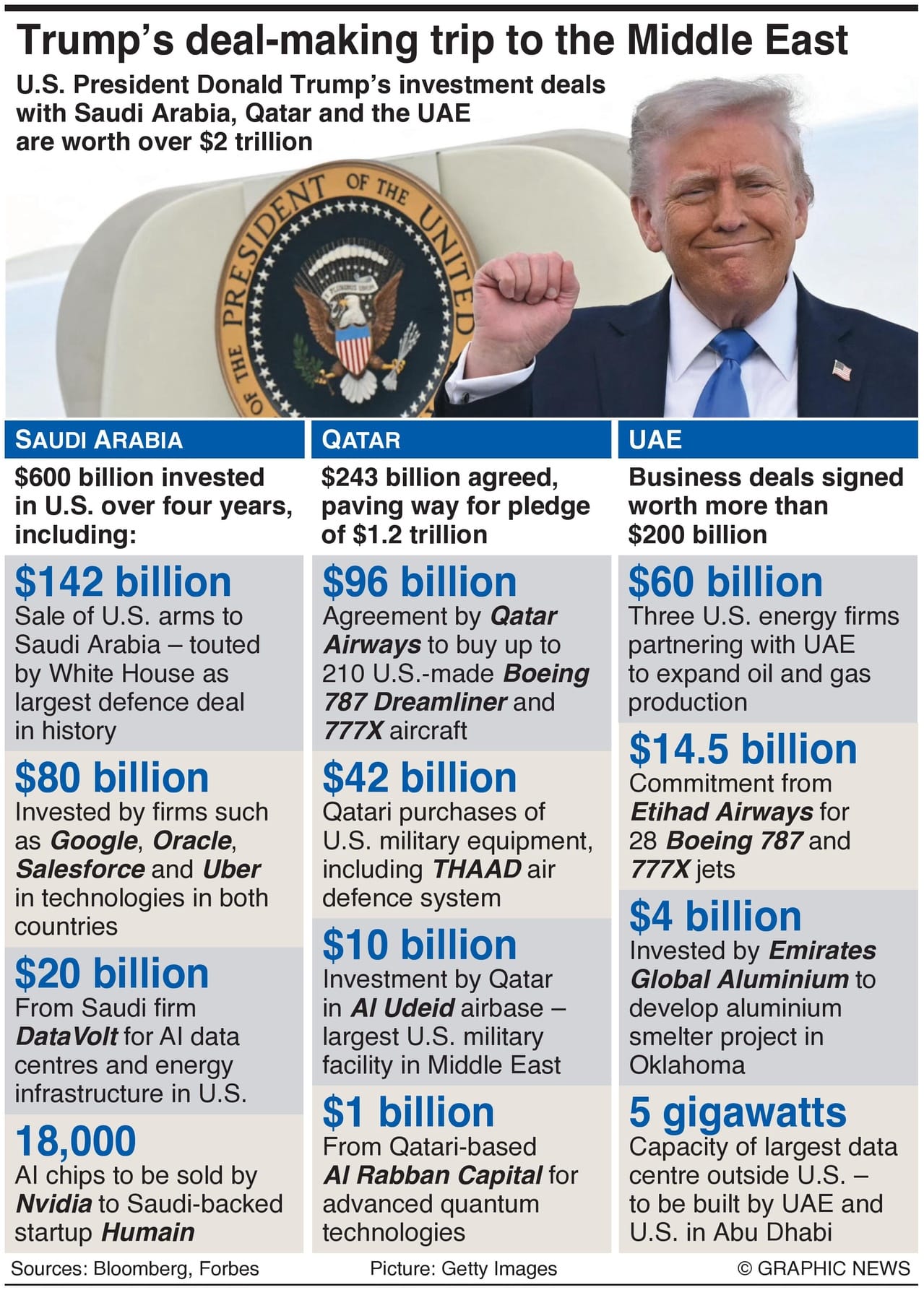 Trump highlighted investments of $600 billion from Saudi Arabia, $243 billion from Qatar and more than $200 billion from the United Arab Emirates. He made scoring business deals a centrepiece of his first planned overseas trip since returning to the office.