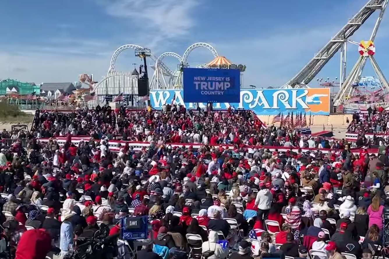 In Deep Blue New Jersey, which is viewing a spectacle as its senior senator Robert Menendez faces a federal corruption trial, Trump held a massive rally. Crowds had packed the beach arena in Wildwood for hours before Trump arrived. "I almost couldn't get here because the traffic was so thick walking from North Wildwood to here," said Denise Keegan, who traveled from National Park, New Jersey.