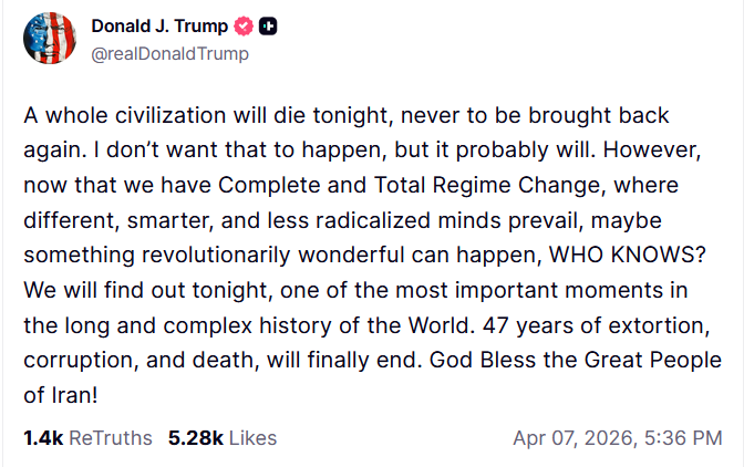 President Donald Trump warned of a potentially devastating night in Iran, suggesting a major turning point could be imminent, according to his social media post.