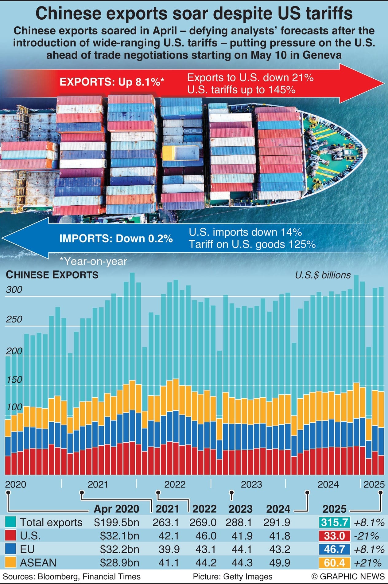China is adapting. It has boosted exports to Europe, India, and Southeast Asia. Overall, its exports rose 8.1% in April, beating expectations.