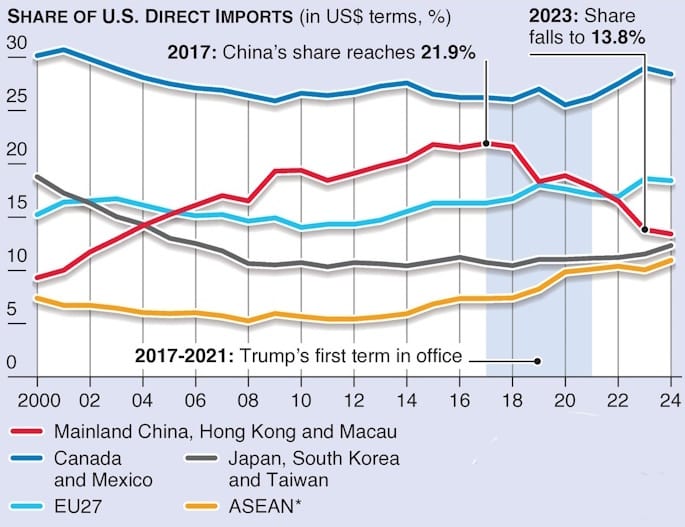 China’s share of U.S. imports peaked in 2017 at 21.9%. It has declined steadily since Trump’s first term and was 13.8% in 2023.