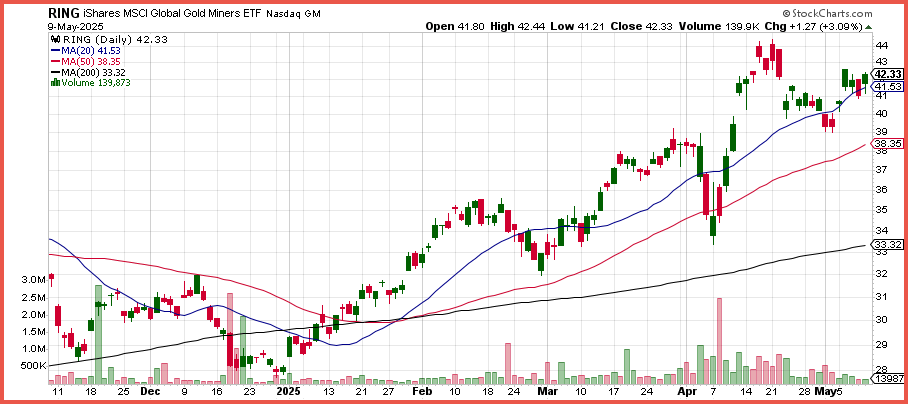 RING tracks global companies focused on gold mining, offering worldwide exposure to the gold production sector.