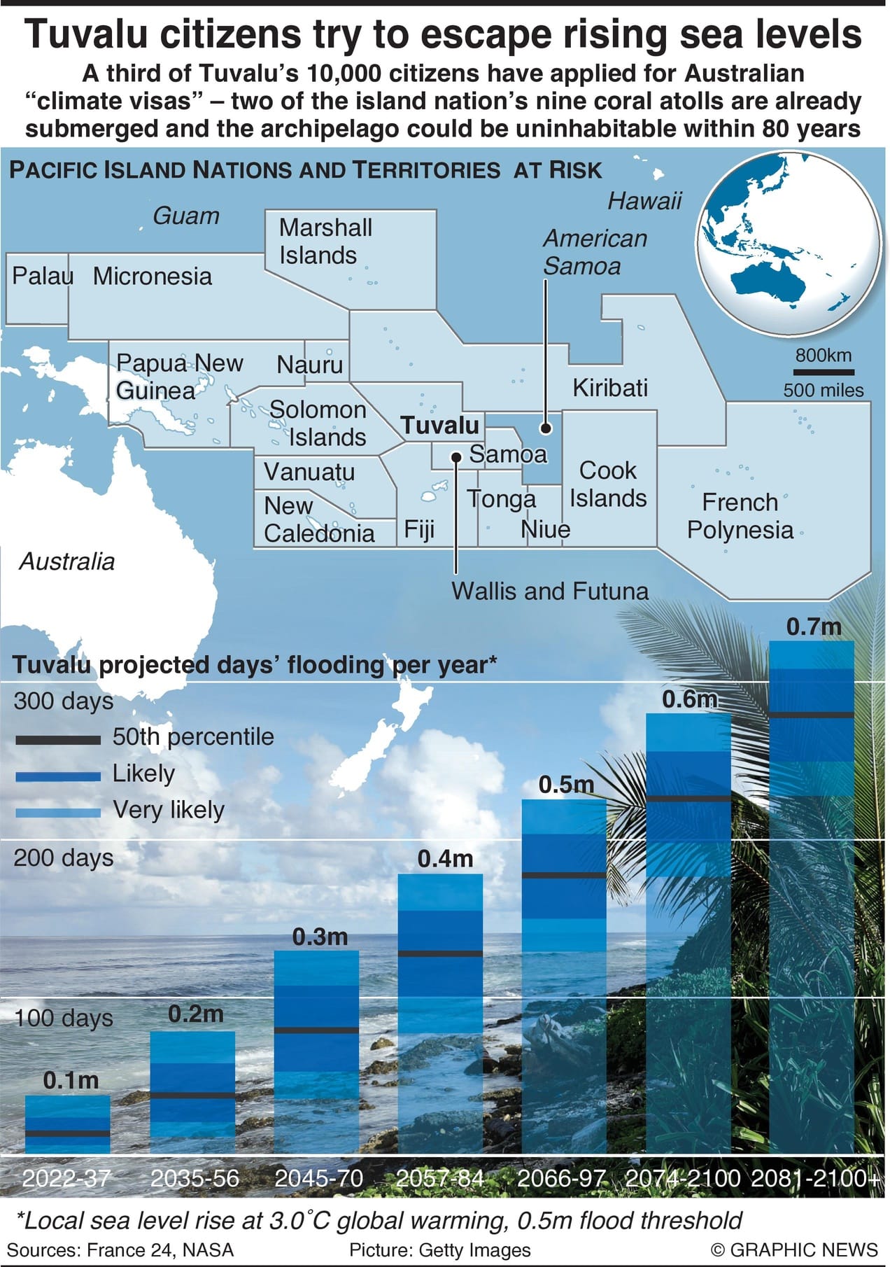 A third of Tuvalu citizens have applied for groundbreaking Australian “climate visas” – two of the island nation’s nine coral atolls are already submerged and the archipelago could be uninhabitable within 80 years.