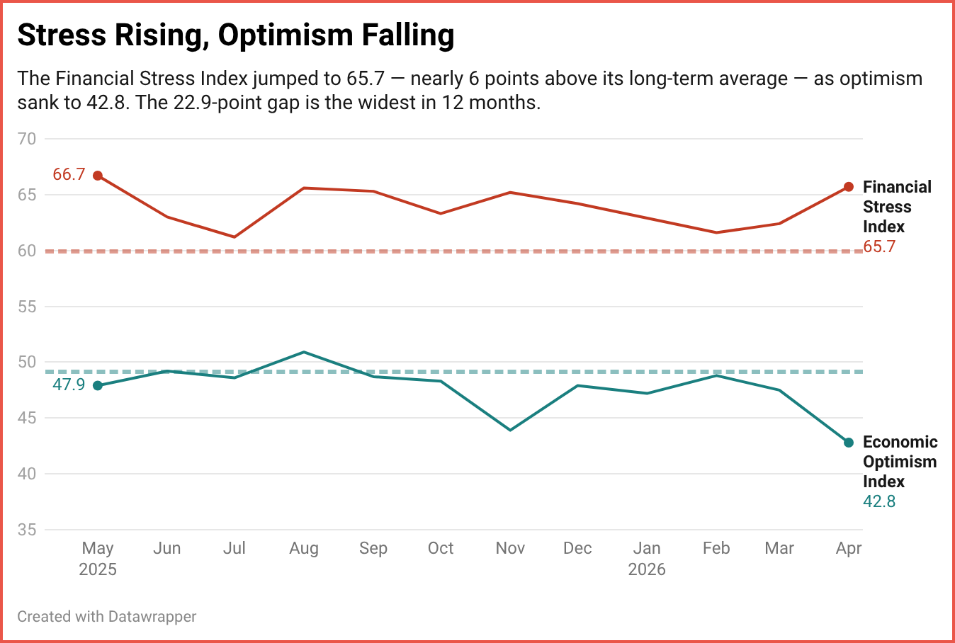 The Stress Index rose 3.3 points (5.3%) from 62.4 in March to 65.7 in April, signaling a sharp increase in financial strain. This reading exceeds the long-term average of 60.5 by 8.6%. The last time the Index posted below 50.0 was before the onset of the pandemic in February 2020, when it stood at 48.1.