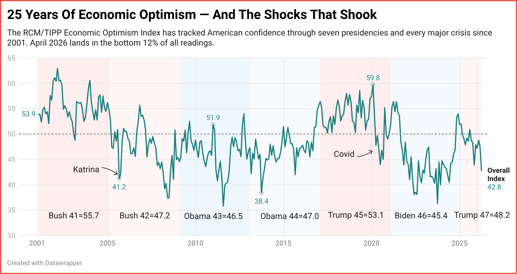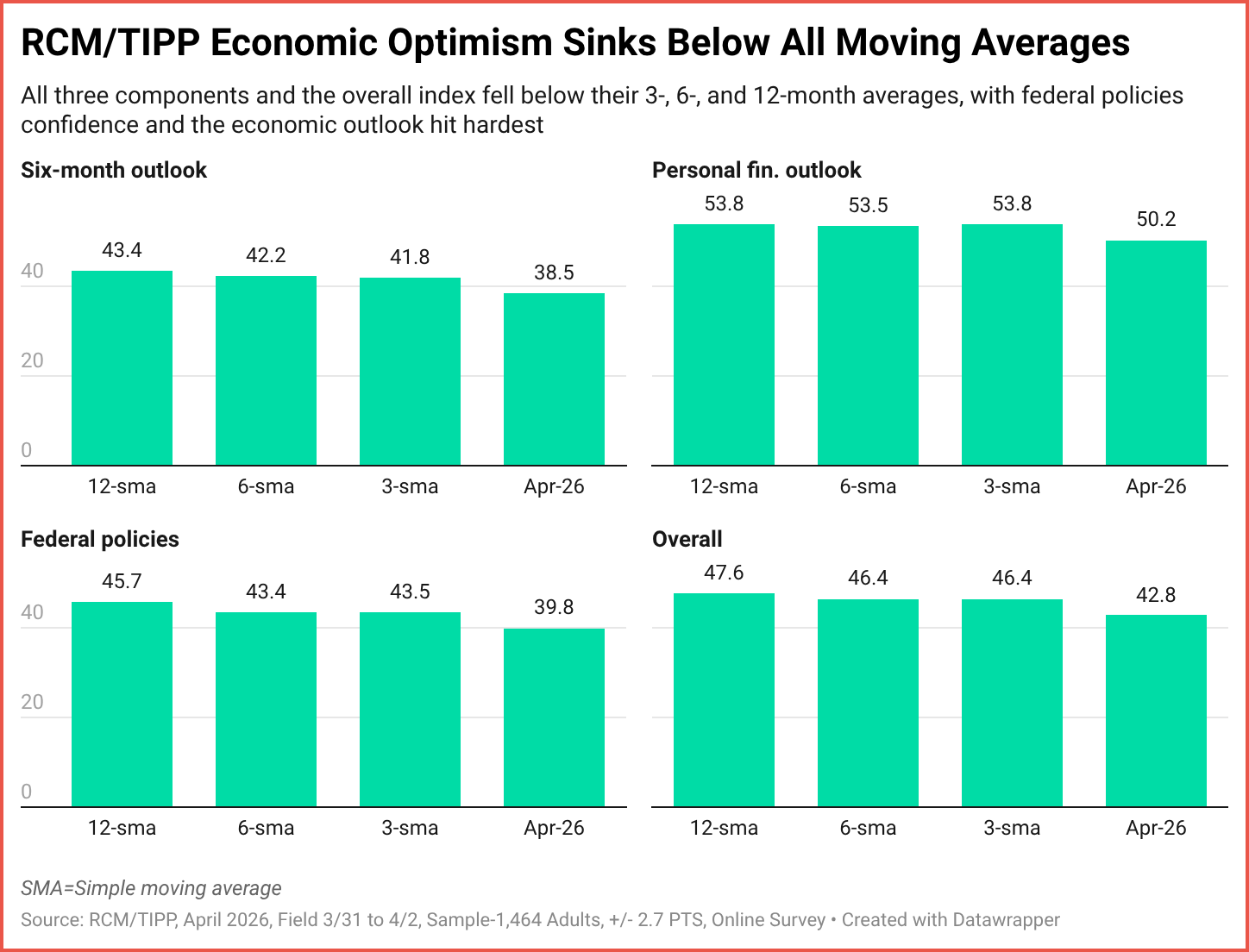 Confidence in Federal Economic Policies, a proprietary RCM/TIPP measure of views on the effectiveness of government economic policies, took the hardest hit, tumbling to 39.8 from 45.1 in March — an 11.8% drop. With the administration navigating a military confrontation in the Middle East alongside rising energy costs at home, Americans’ faith in the policy apparatus is eroding.