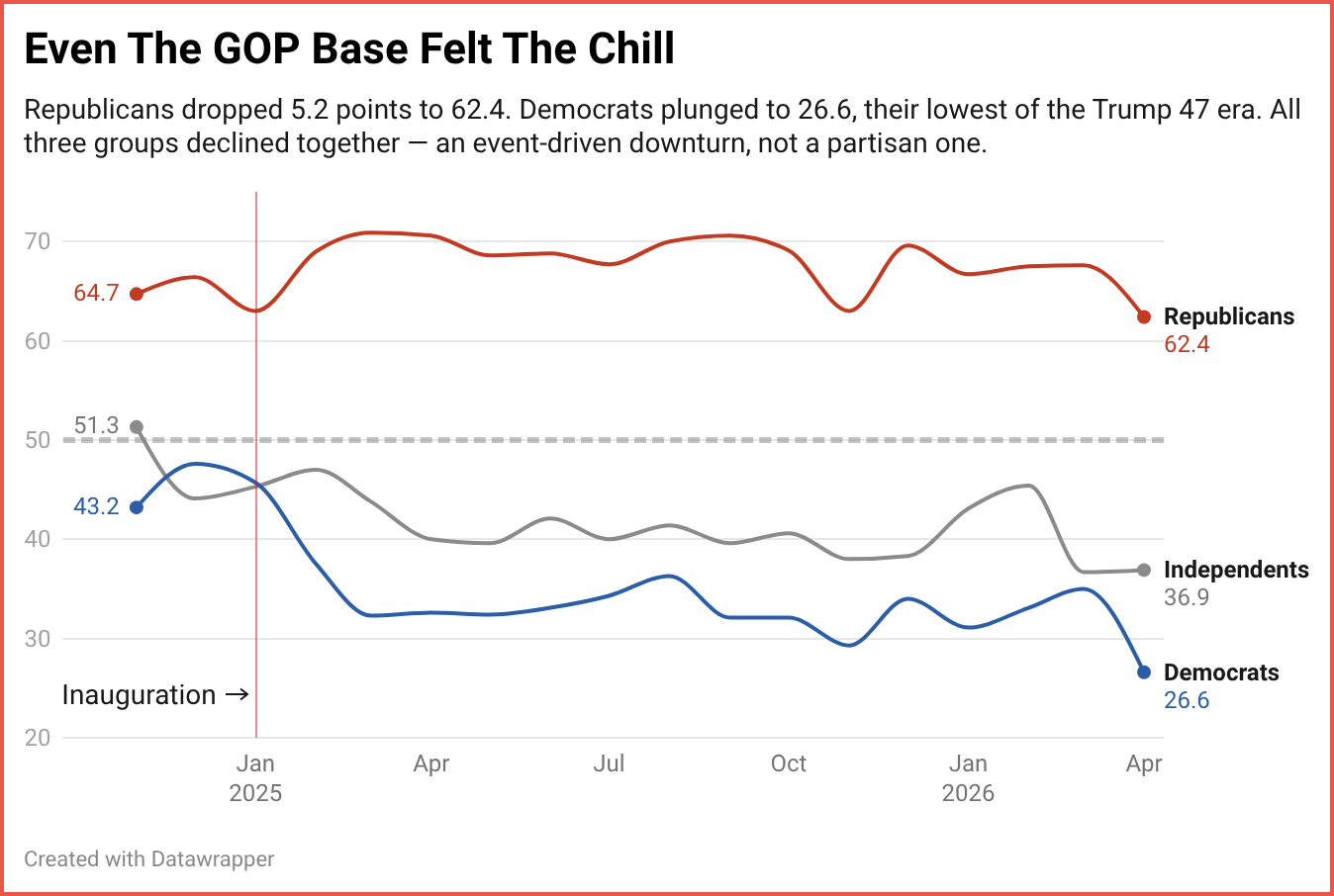 Republicans dropped 5.2 points to 62.4, their lowest reading since November 2025. Democrats plunged to 26.6, the lowest level of the Trump-47 administration. Independents, who had briefly shown signs of hope in February at 45.4, settled at 36.9.