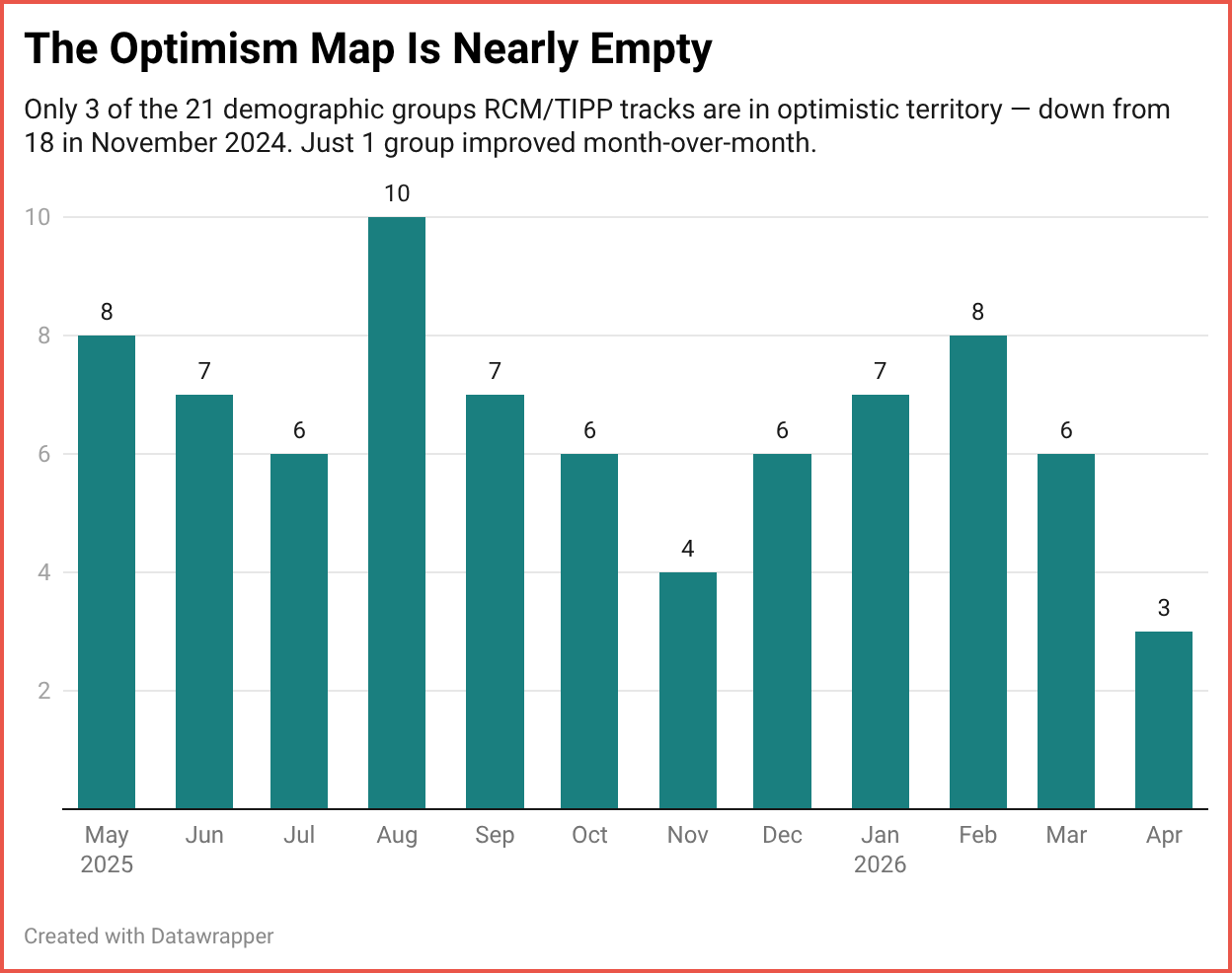 Of the 21 demographic groups the RCM/TIPP Economic Optimism Index tracks each month, spanning age, gender, race, income, party, and investor status, 20 declined in April. Only independents bucked the trend by a barely perceptible 0.2 points.