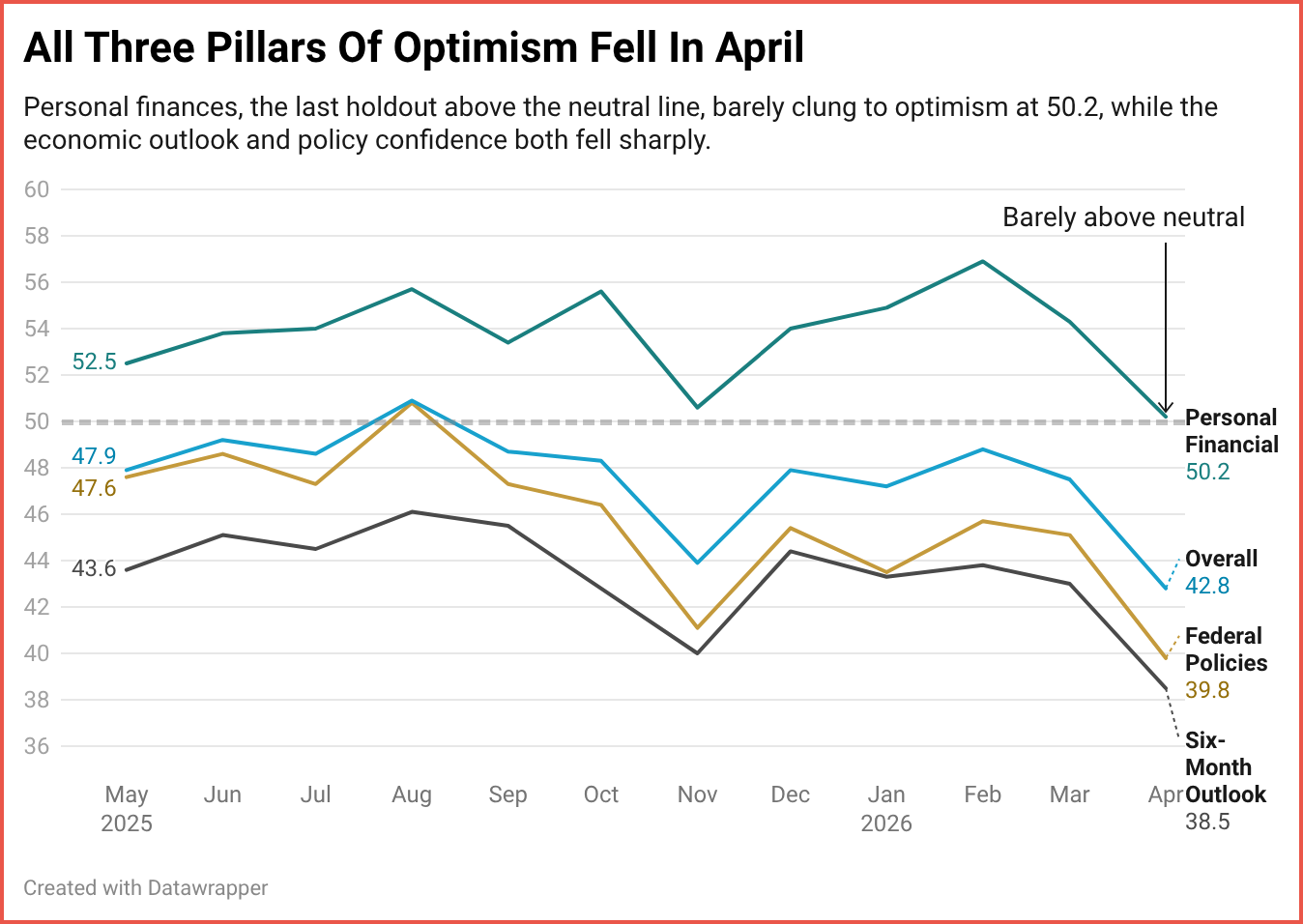 The Personal Financial Outlook, a measure of how Americans feel about their own finances over the next six months, dropped 7.6% from 54.3 in March to 50.2 — barely clinging to the neutral line. For months, personal finances had been the lone bright spot, holding comfortably above 50 even as the other two components flagged. That cushion is now razor-thin.