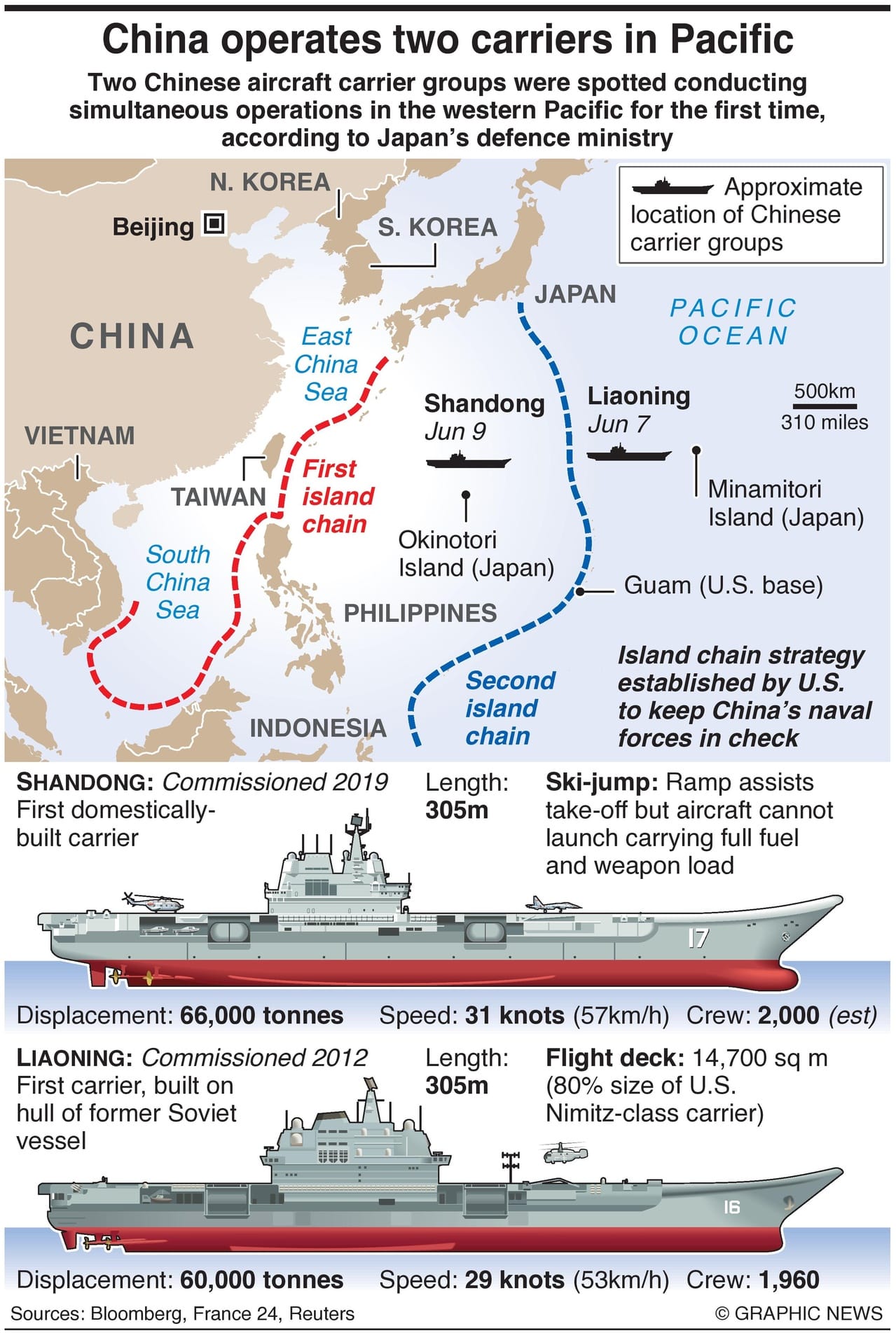 On Saturday, the carrier Liaoning was seen inside the EEZ of the uninhabited Japanese island of Minamitori, more than 1,800km southeast of Tokyo, and remained in the region with other warships on Sunday, the Joint Staff Office said earlier, according to Bloomberg.