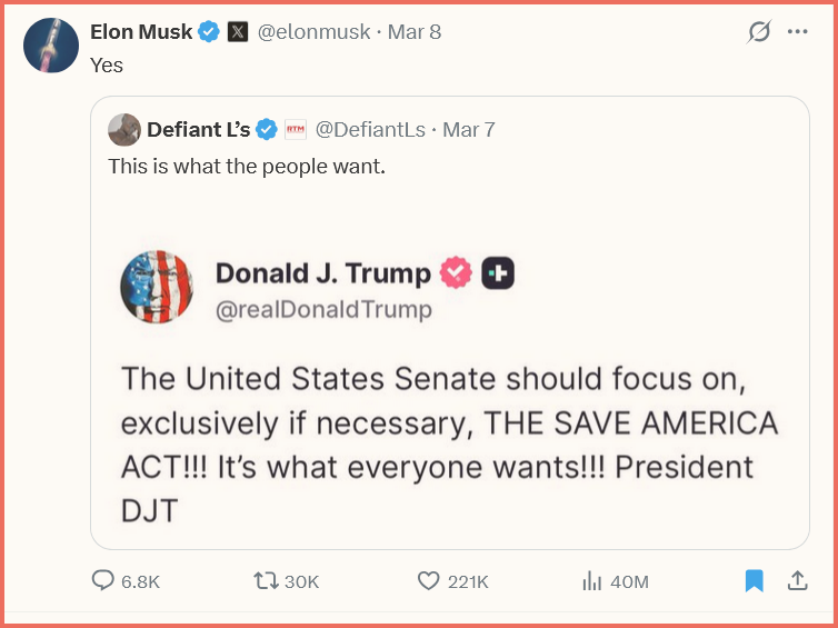 President Donald Trump has made SAVE his No. 1 legislative priority, saying he won't sign any legislation until SAVE is passed by Congress. That turns up the heat under the Republican leaders in Congress to make it their priority, too.