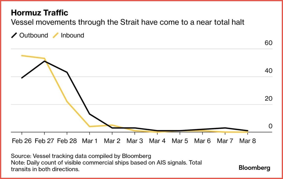 While some tankers are still making the passage, overall traffic through the Strait of Hormuz has dropped sharply. Vessel-tracking data show commercial ship movements collapsing in recent days, with many operators delaying or rerouting voyages amid escalating tensions in the Gulf. The slowdown underscores the fragility of a chokepoint that carries a large share of the world’s oil supply.