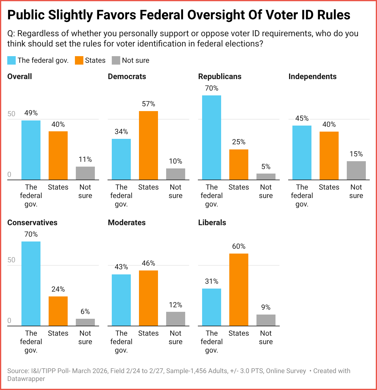 I&I/TIPP tacked on a second question: "Regardless of whether you personally support or oppose voter ID requirements, who do you think should set the rules for voter identification in federal elections?"