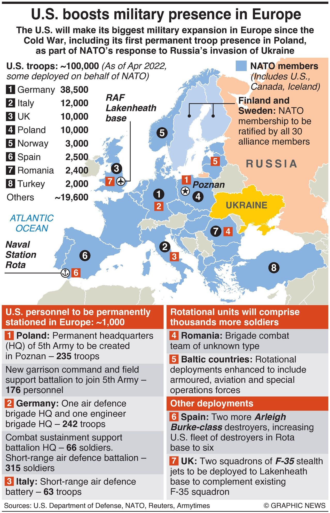 Two squadrons of US F-35 fighter aircraft will be sent to the UK, Biden added, in addition to stationing air defense systems in Italy and Germany and increasing the number of US naval destroyers to Spain to six from four.