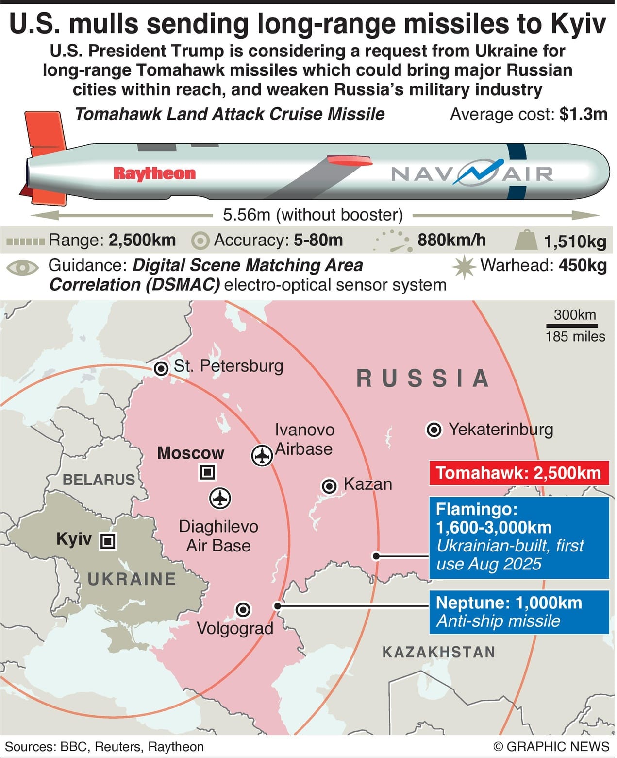 U.S. President Trump is considering a request from Ukraine for long-range Tomahawk missiles which could bring major Russian cities within reach and weaken Russia’s military industry.