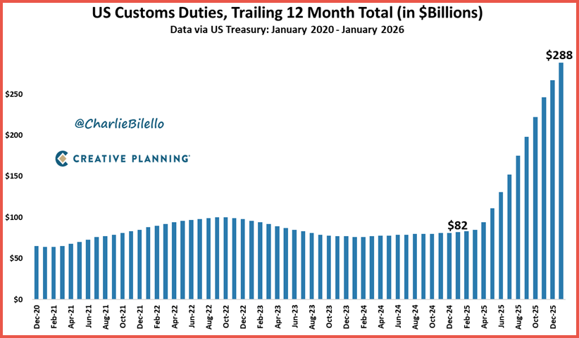 The U.S. collected a record $288 billion in customs duties over the past year, more than triple the level seen just a few years ago. Higher tariffs and increased import values have sharply boosted government revenue from trade taxes.