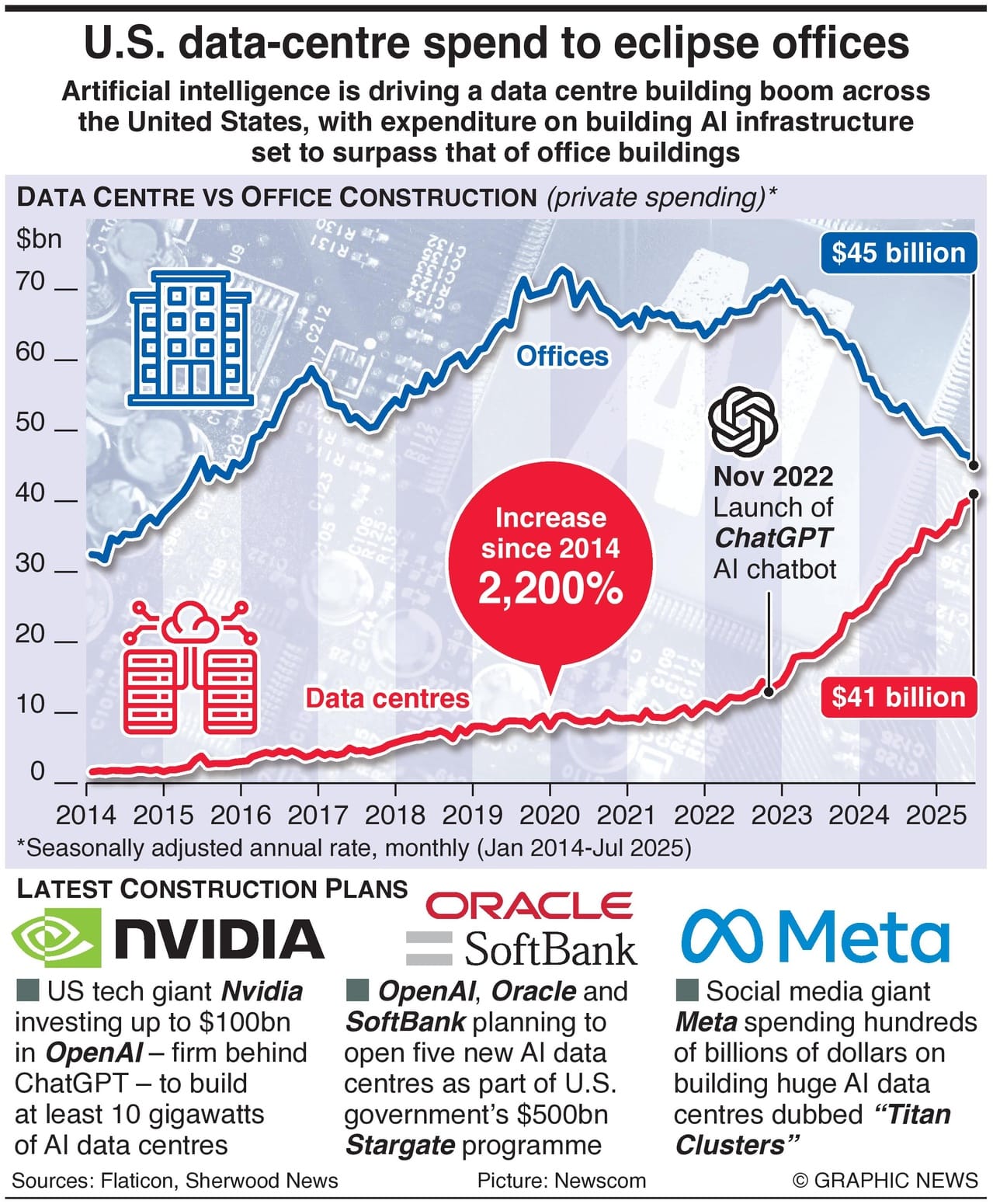 Artificial intelligence is driving a data center building boom across the U.S., with spending on building AI infrastructure set to surpass that of office buildings.