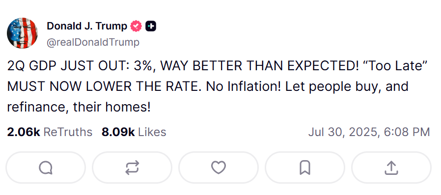 🚨 "BETTER THAN EXPECTED": The economy grew at a 3.0% rate in Q2 — shattering economists' expectations once again. pic.twitter.com/MLlSTTbGiQ