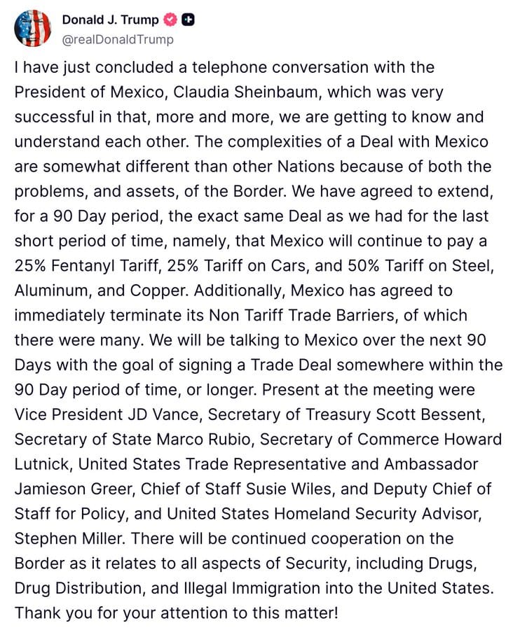 President Donald Trump announced Thursday he will extend existing tariffs on Mexican imports for 90 days as trade talks continue with President Claudia Sheinbaum.