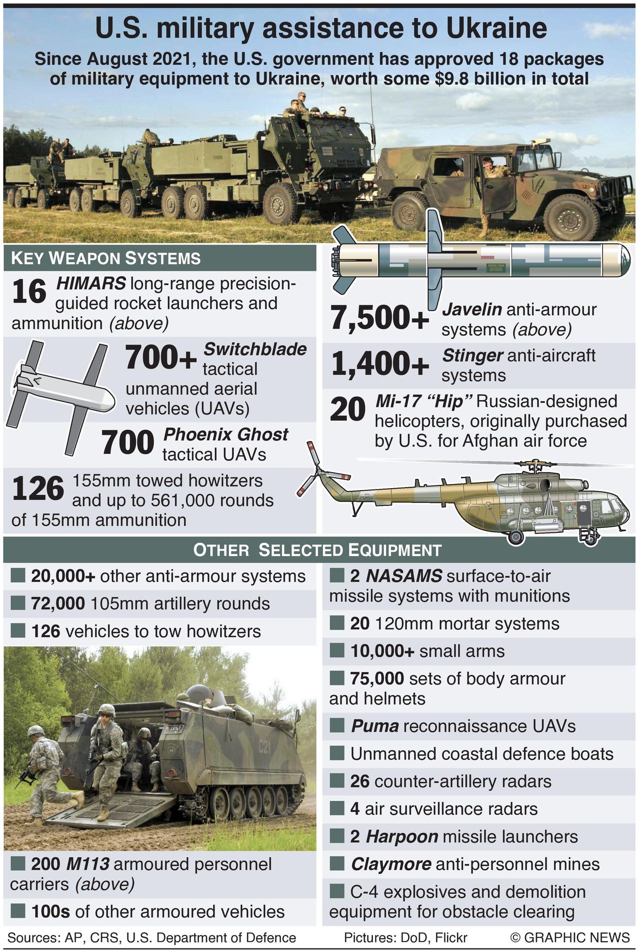 The new U.S. aid includes additional rockets for the High Mobility Artillery Rocket Systems, or HIMARS, as well as thousands of artillery rounds, mortar systems, Javelins and other ammunition and equipment. Military commanders and other U.S. officials say the HIMARS and artillery systems have been crucial in Ukraine’s fight to block Russia from taking more ground, AP said