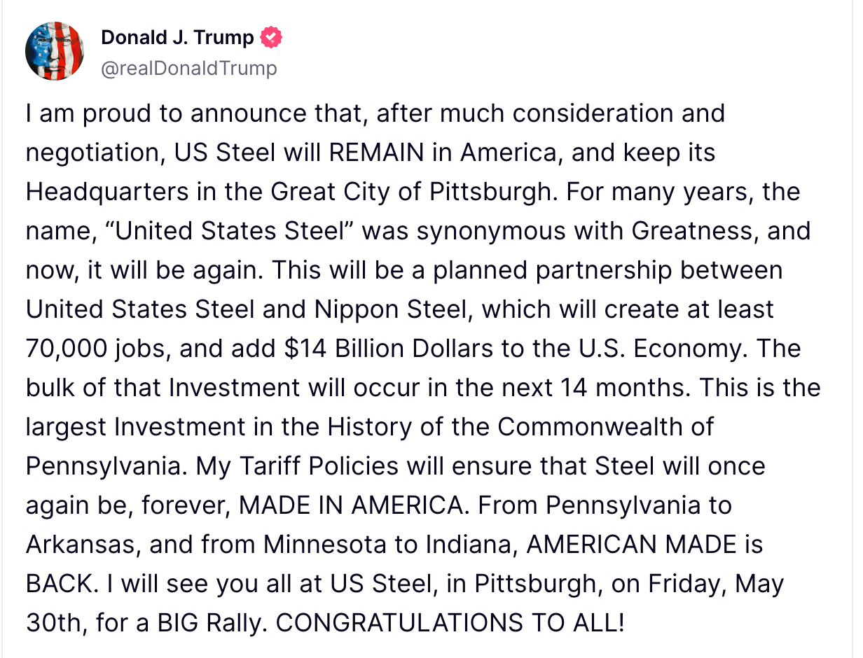 Trump emphasized the deal as a victory for American manufacturing and a direct result of his tariff policies. “Steel will once again be, forever, made in America,” he said.