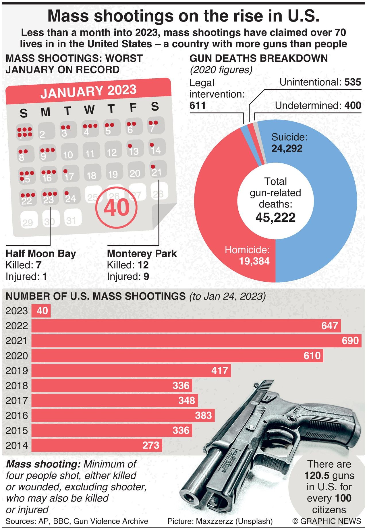 Less than a month into 2023, mass shootings have claimed over 70 lives in in the United States – a country with more guns than people.