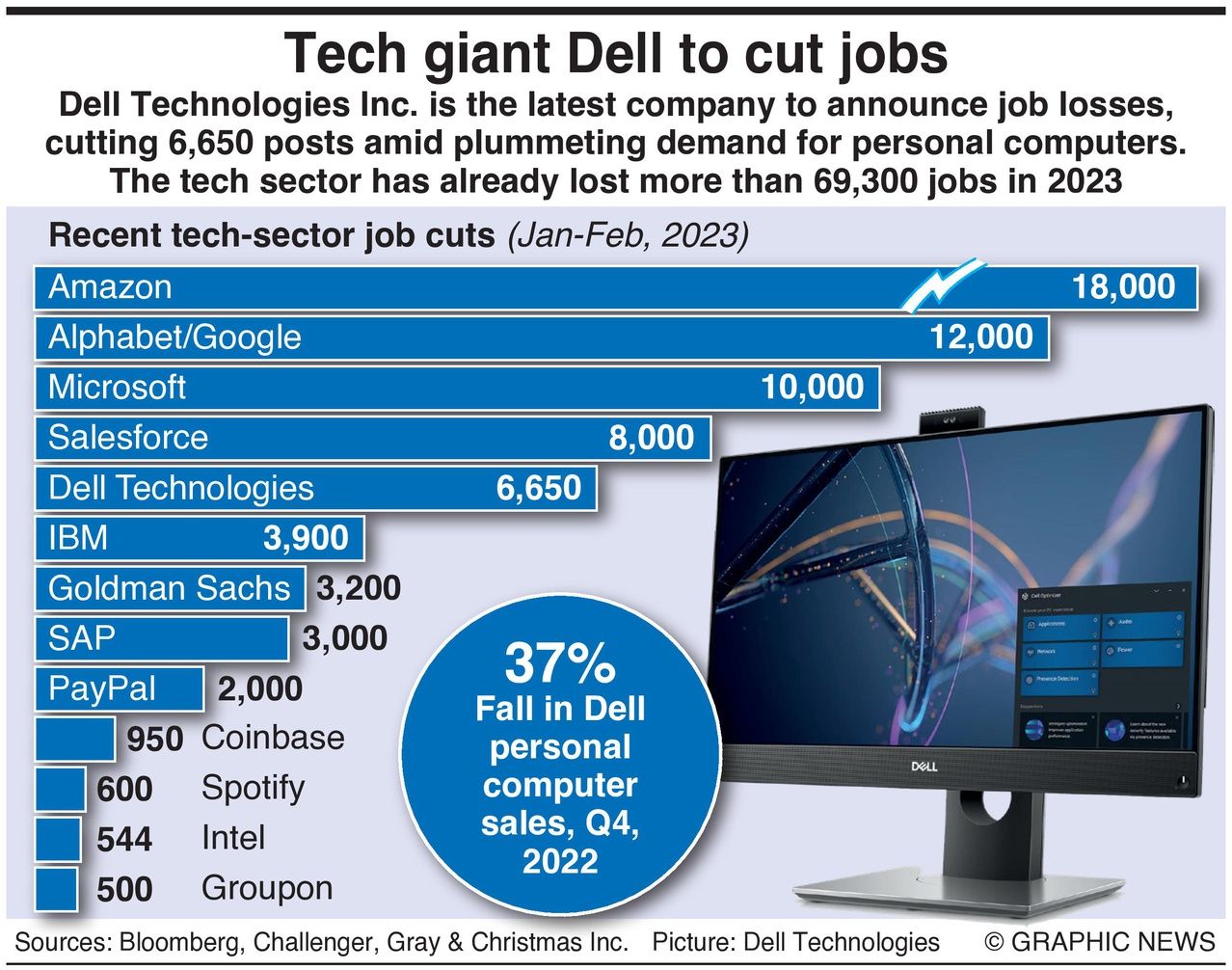 Dell Technologies Inc. is the latest company to announce job losses, cutting 6,650 posts amid plummeting demand for personal computers. The tech sector has already lost more than 69,300 jobs in 2023.