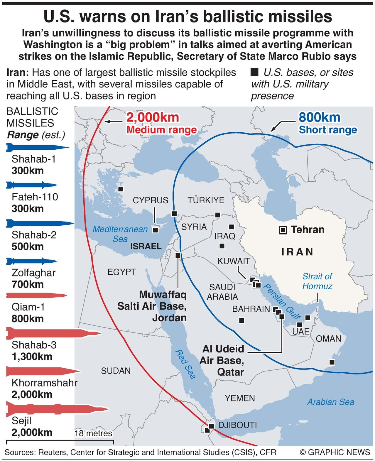 Iran’s unwillingness to discuss its ballistic missile program with Washington is a “big problem” in talks aimed at averting American strikes on the Islamic Republic, Secretary of State Marco Rubio says.