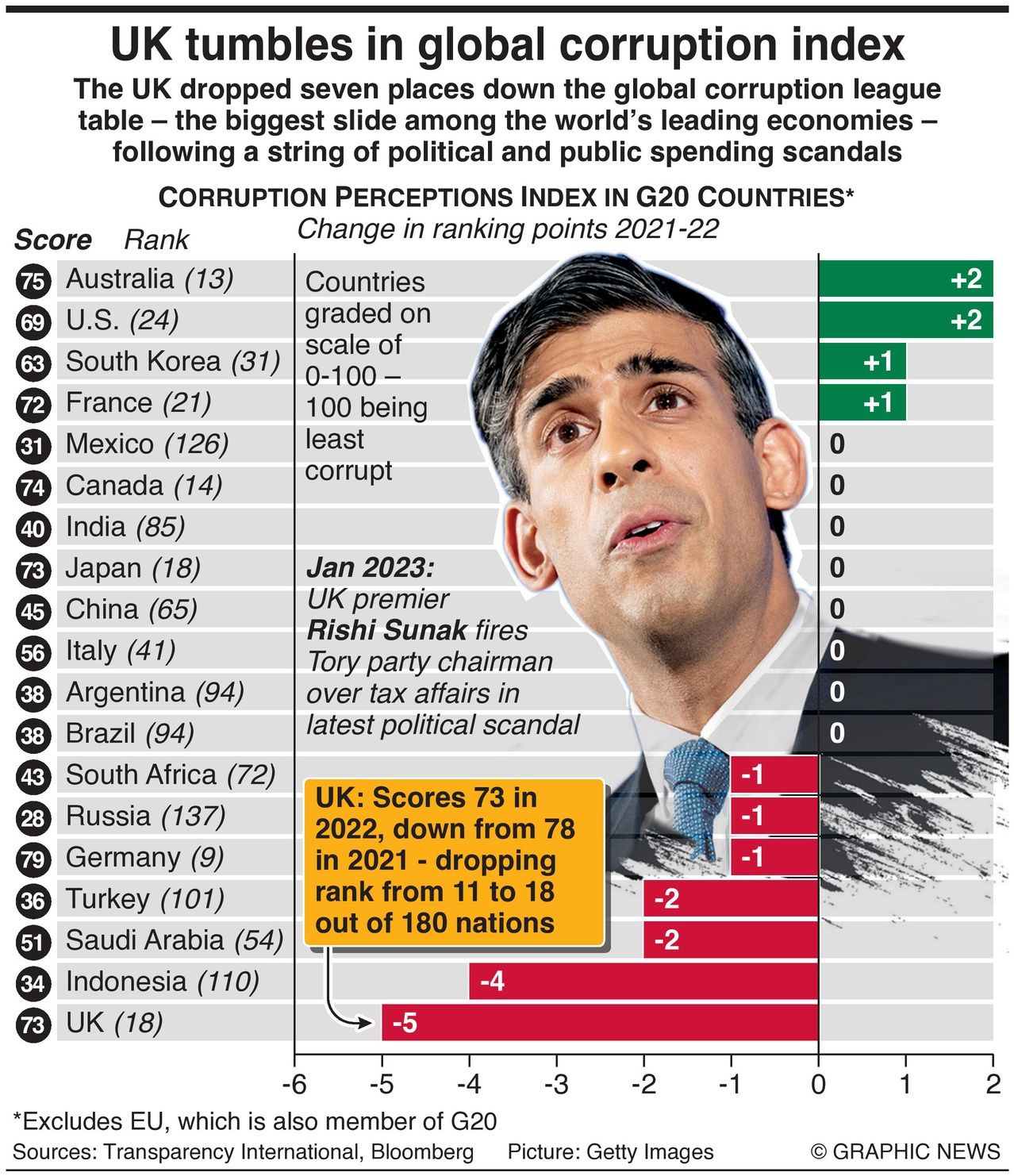 The index grades a country from zero to 100, the latter being perceived as least corrupt. The UK scored 73, sliding from 78 a year earlier.