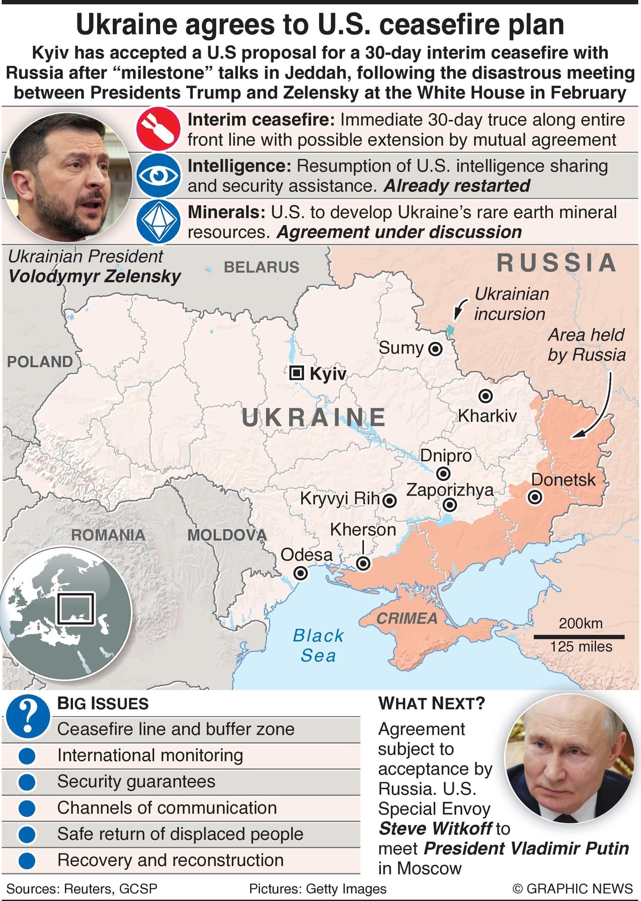 Kyiv has accepted a U.S proposal for a 30-day interim ceasefire with Russia after “milestone” talks in Jeddah, Saudi Arabia, following the disastrous meeting between Presidents Trump and Zelensky at the White House in February.