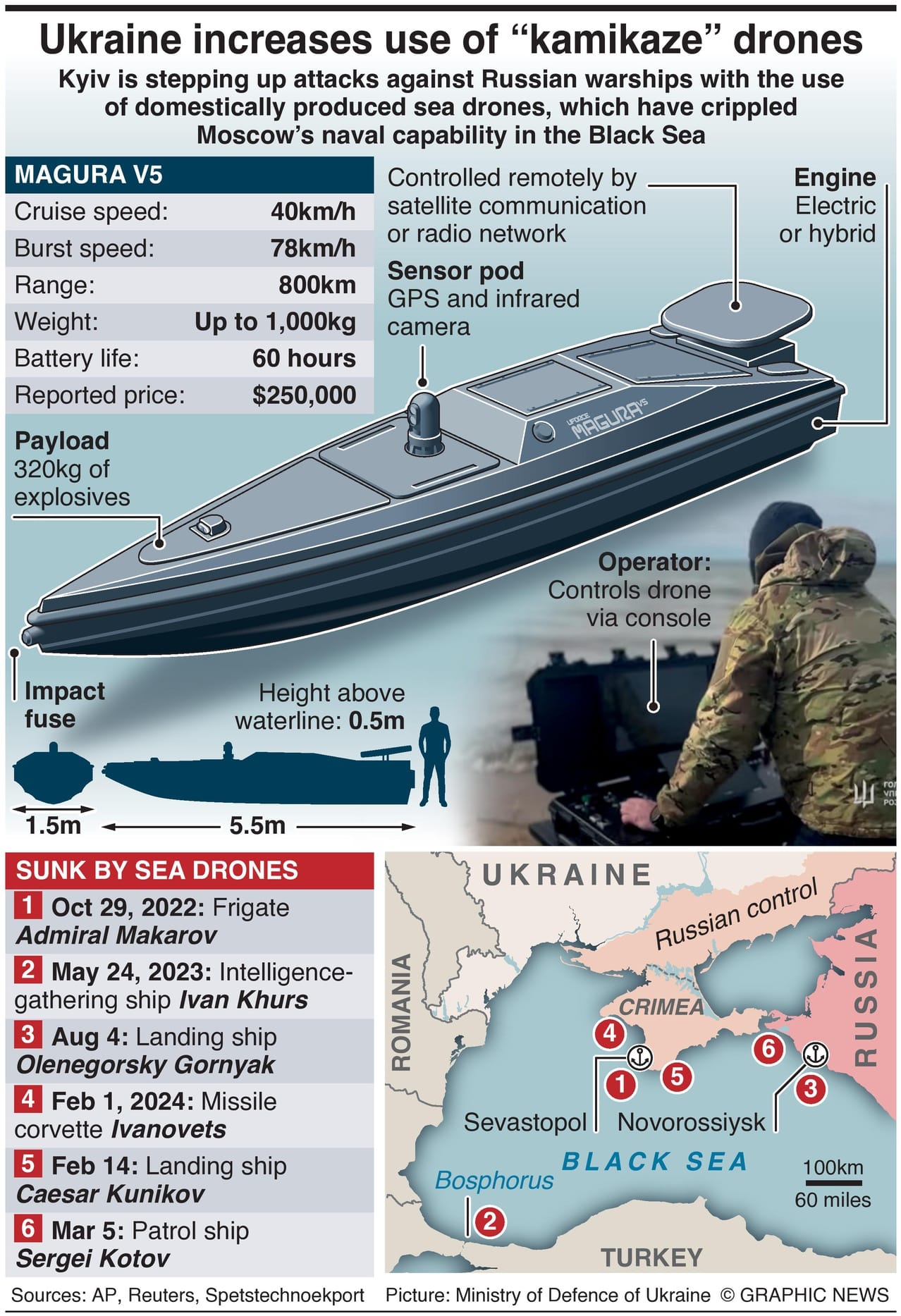 The Magura V5, named after a Slavic goddess of war, has an 800 km range, so it can easily reach the Crimean peninsula and even the Russian coastline. It can allegedly carry 350kg of payload, enough to sink a warship.