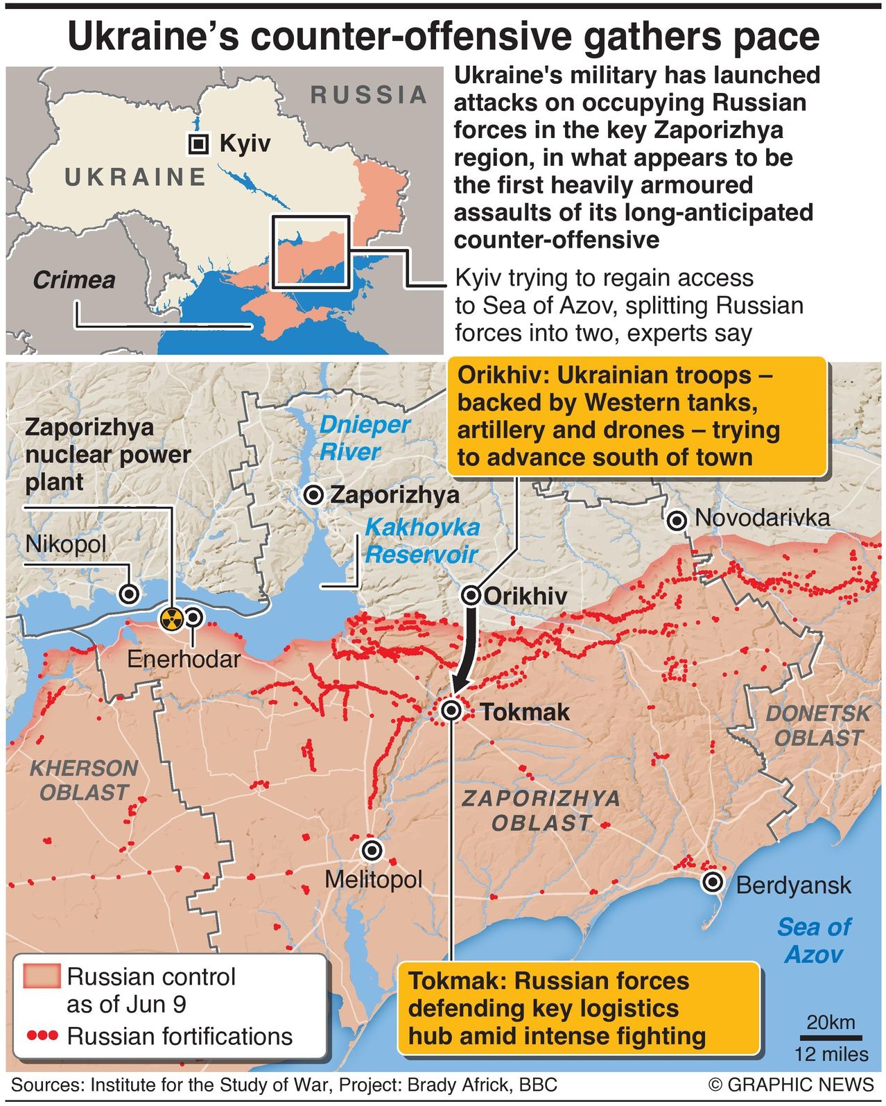 Russian officials and military bloggers say Ukrainian troops – backed by tanks, artillery, and drones –are trying to advance south of Orikhiv, BBC reports.