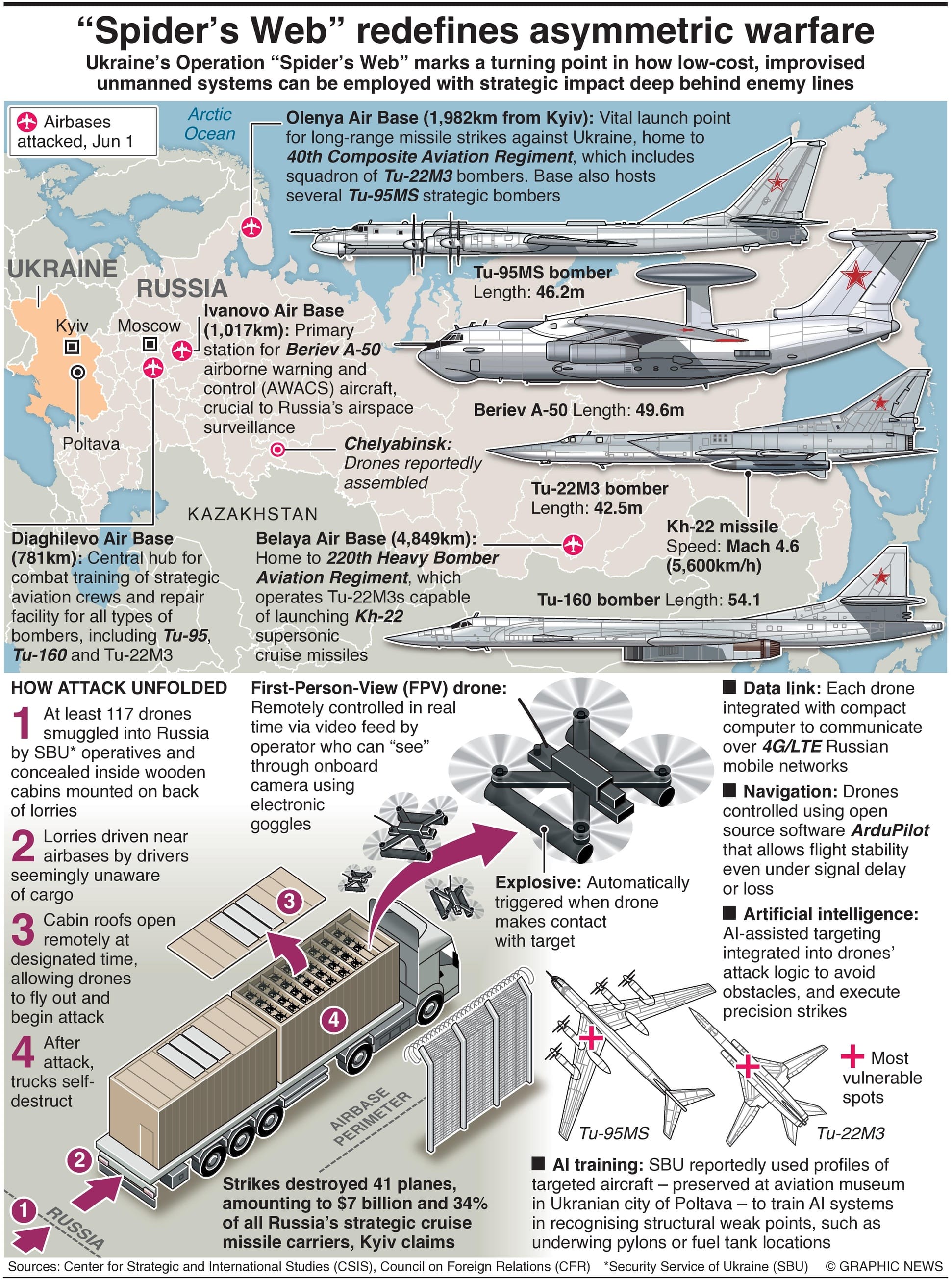 Footage released by Kyiv shows drones striking Russian strategic bombers and even landing on the dome antennas of two A-50 airborne early warning aircraft – of which there are only a handful in Russia's fleet.